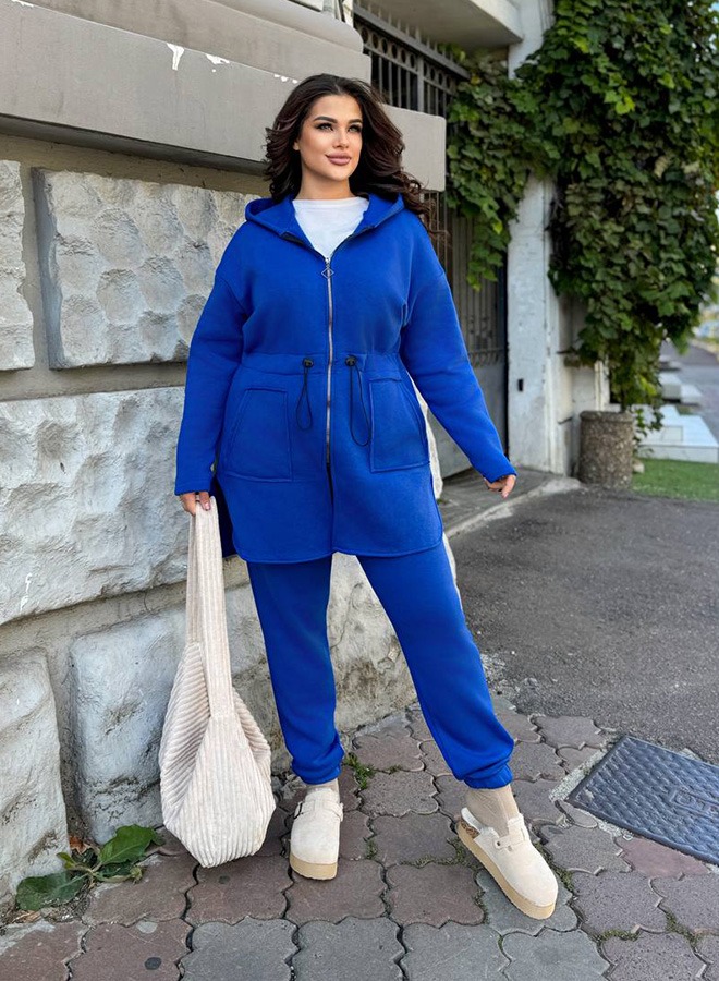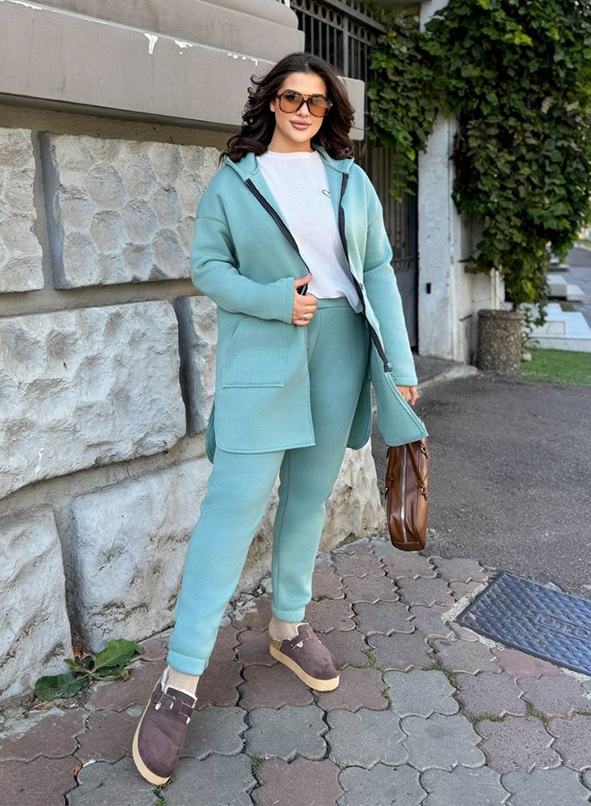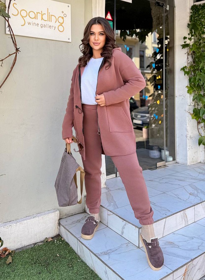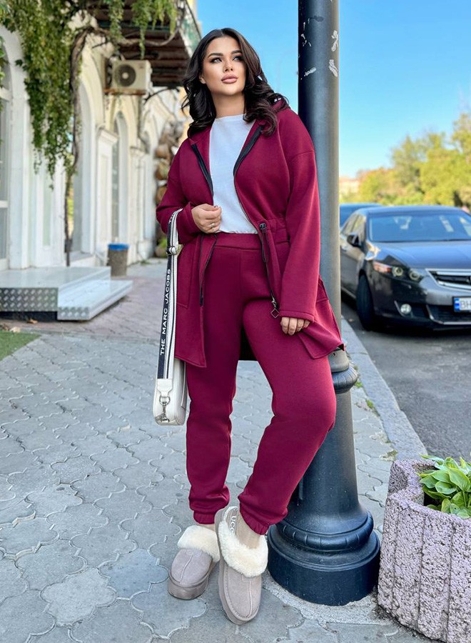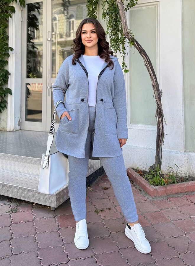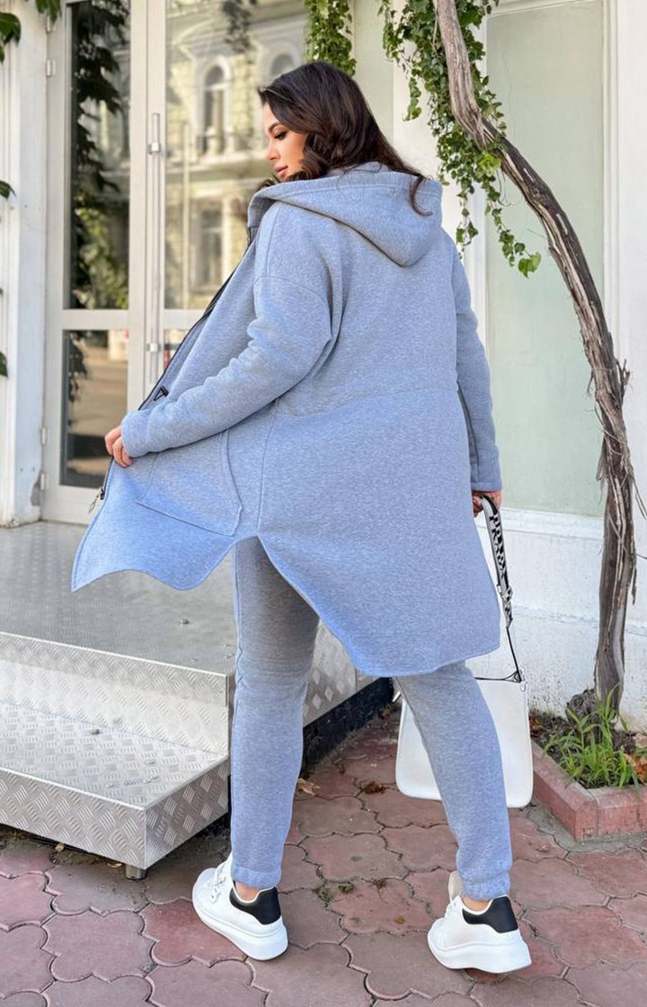Практичний костюм двійка - ідеальний вибір для зручних та стильних образів. Асиметричний кардиган із капюшоном і куліскою по центру додають оригінальності костюму.