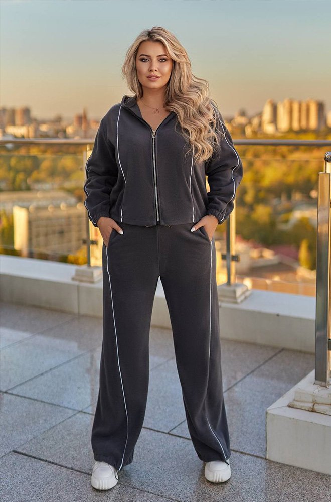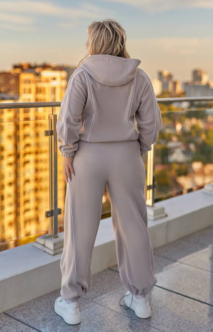 Кофта на блискавці з капюшоном вільного прямого крою, зручні кишені по боках, по низу на резинці з фіксатором для коригування потрібного обʼєму і довжини. Кофта спереду і ззаду прикрашена кантом. Штани з кишенями, вільні, знизу на резинці з фіксацією, можна затягнути, по боках - подвійний лампас. Костюм з якісного трикотажу-флісу. М'який, теплий, ніжний!